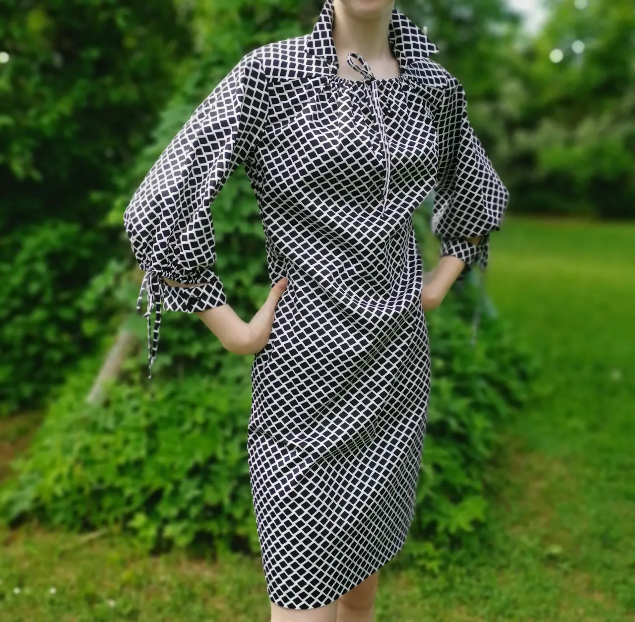 Sirge lõikega. Põlvini. Küljeõmbluses taskud. Kraega. Kaelus ja poolvarrukad paelaga kokku kroogitavad. Varruka mansett kinnitatav ühe kandilise nööbiga. Kangas kergelt veniv, masinas pestav. Kleit käib selga üle pea.