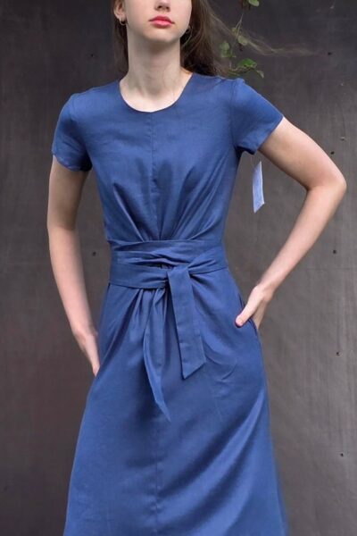 Seosega kleit.Vöö seotakse eest risti, siis seljatagant risti ja ette sõlme.Sinine kleit lühikeste varrukatega. Küljeõmbluses taskud. Veidi venivast hästi hingavastlina-viskoosisegusest kangast.Kergelt A-lõikeline siluett. Taga lukk.Voodrita.