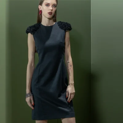| 36, 38, 40 | Väike must kleit. Karvase õlakuga. Ülespoole põlve pikkusega. Õhukese veniva voodriga. Struktuuriga veidi veniv kangas. Lukk seljal. Suurus 36 (rind 84cm, talje 66cm, puus 92cm) Seljapikkus 95cm |