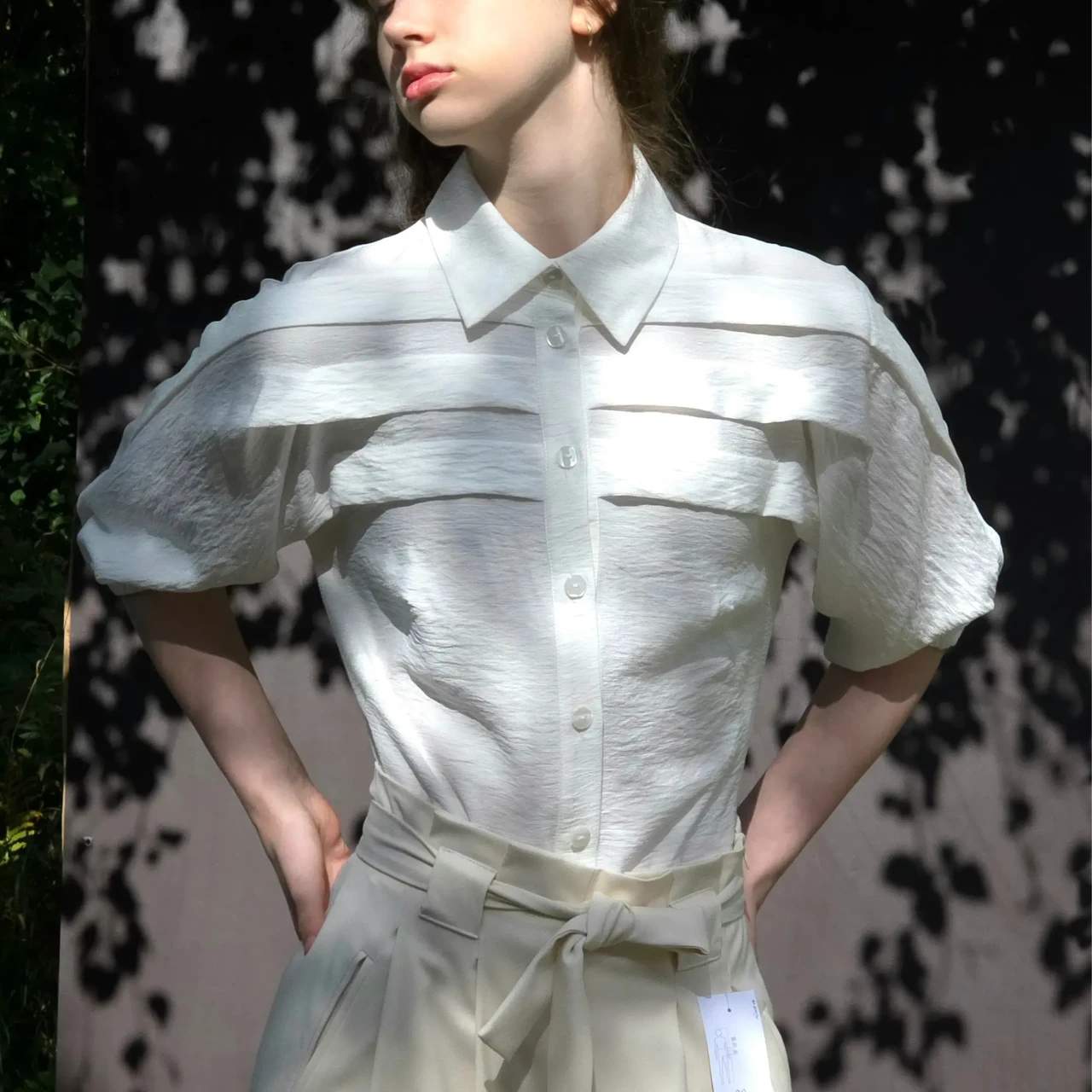 Pluus valge volditud rinnaga L 2025
