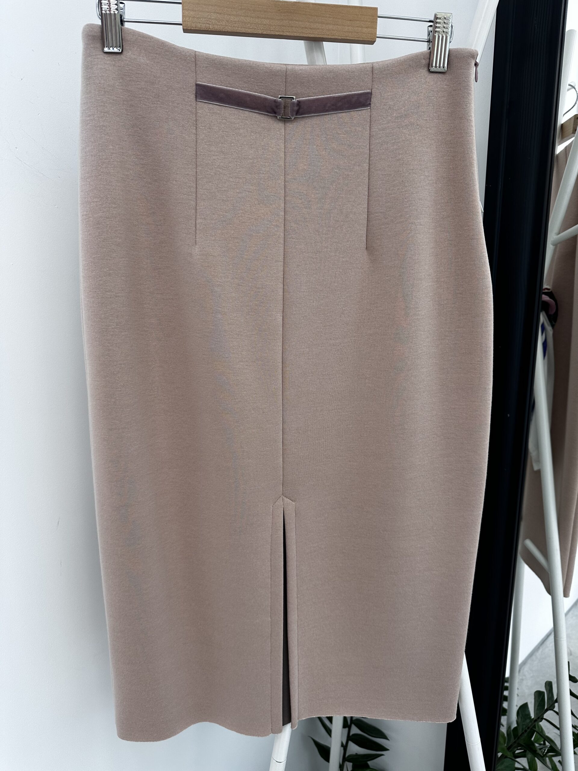 Gerda on ülepõlve seelik millel on ees läbilõige ja taljet rõhutab kaunistuspael metall detailiga. Küljel on peitlukk.