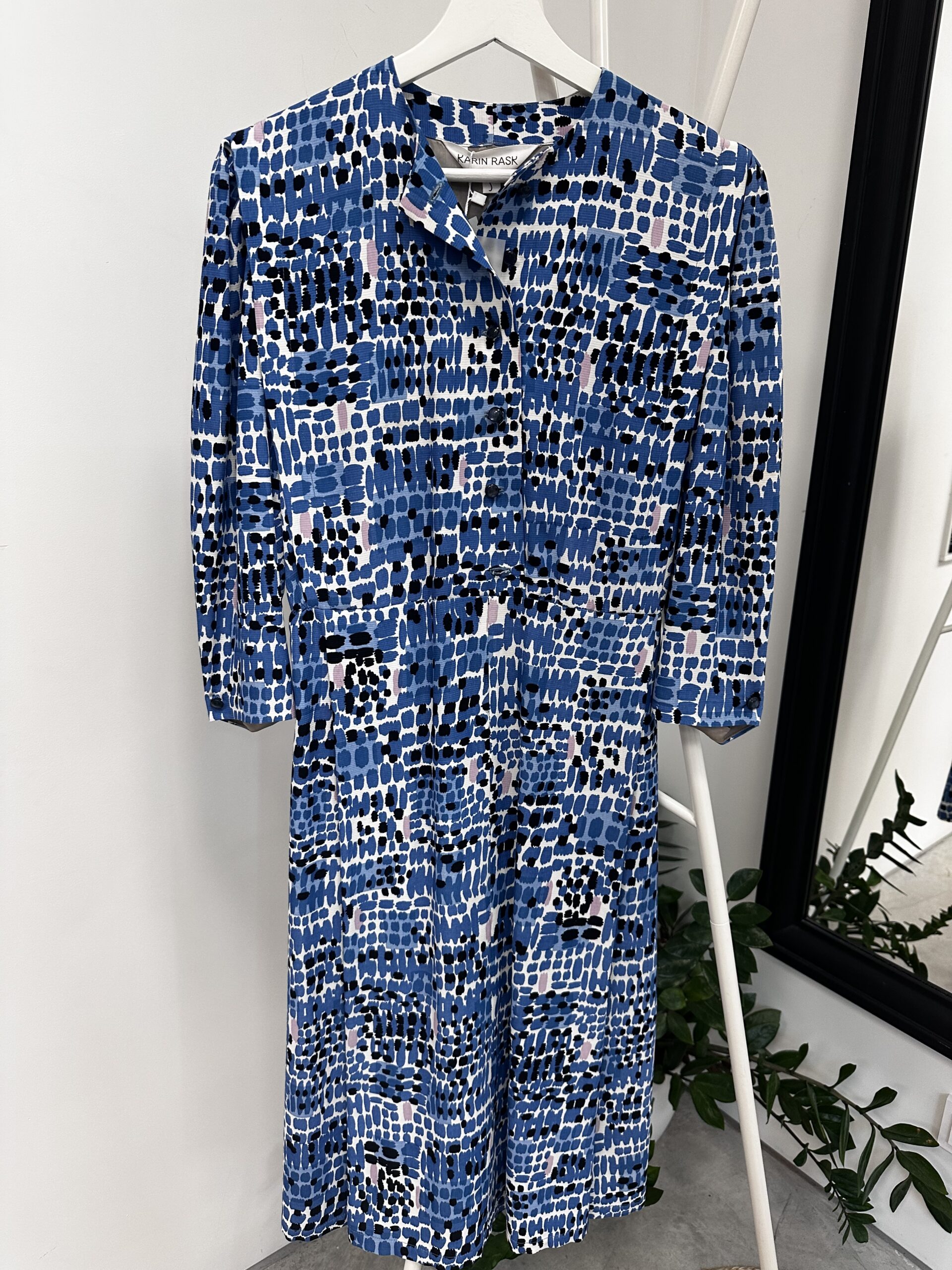 Eest nööpidega, vöökohast läbilõikega, taskutega voodril kleit. Kolmveerand varrukad. Väga hästi istuv. Üks ja ainus! Pikkus 110cm.