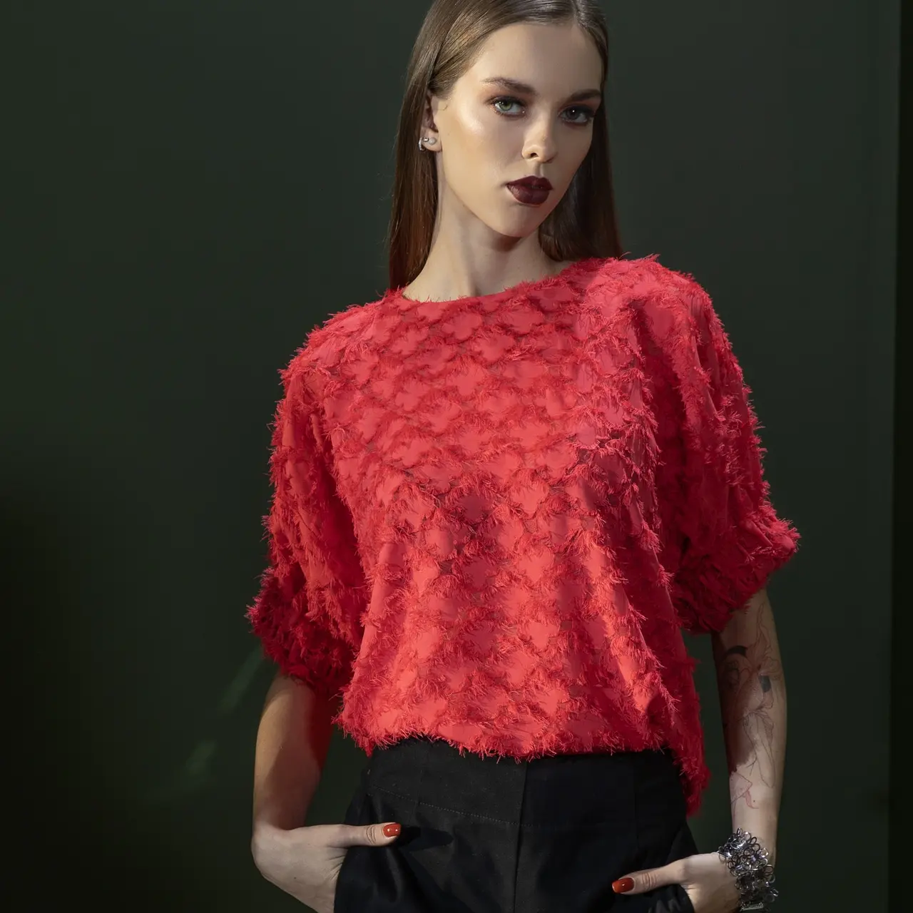 Pluus, varruka otstes 5cm laiune kumm. Kaelus avatav selja tagant ühe nööbiga. "Karvase" mustriga punasest kangast või siledast viskooskangast. Siledast viskooskangast pluusi kaeluse sisemine kant kinnitatud väikeste ilukividega.