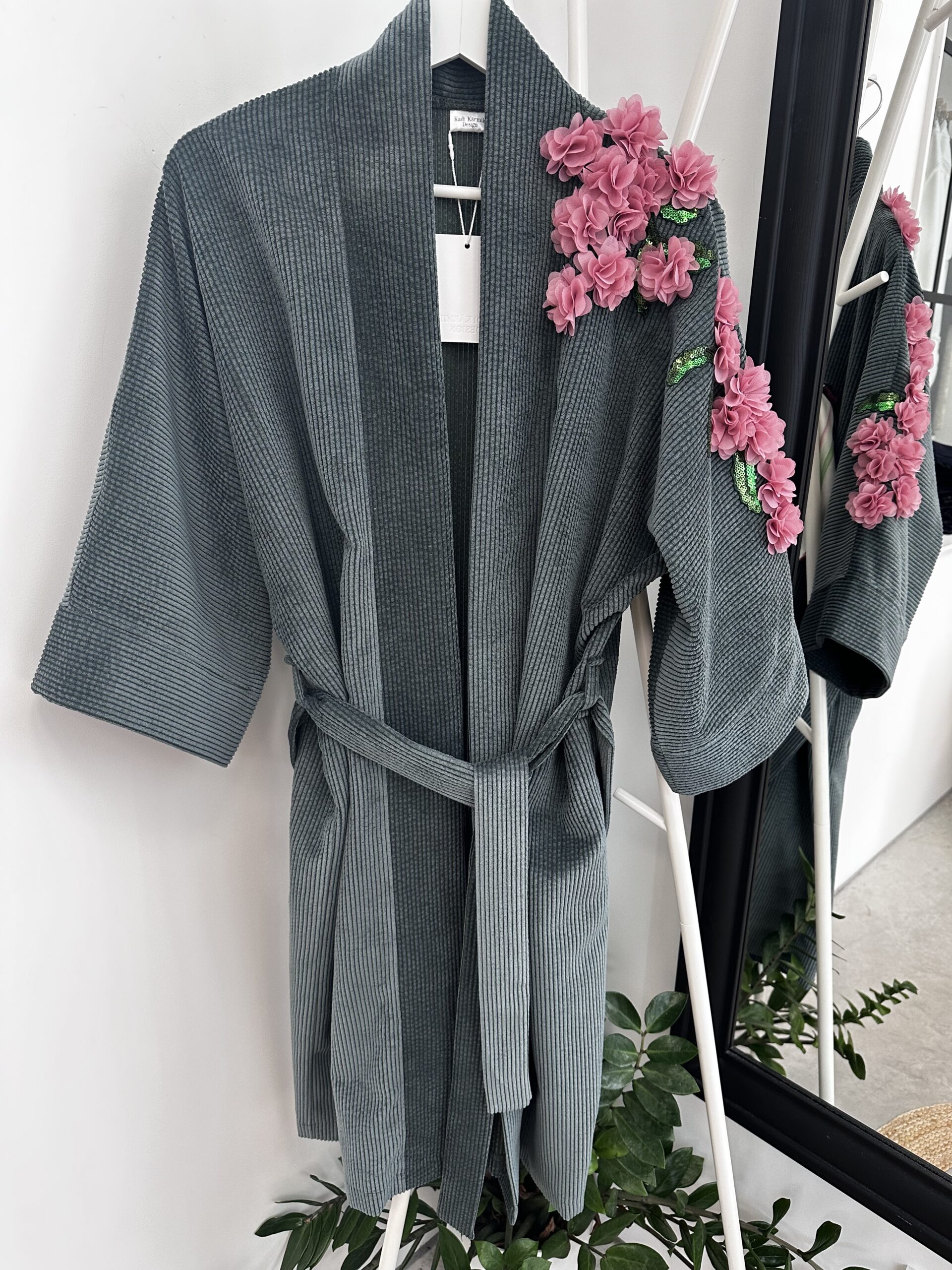 Poolpikk velvetist kimono, ühel varrukal efektsed lilled.