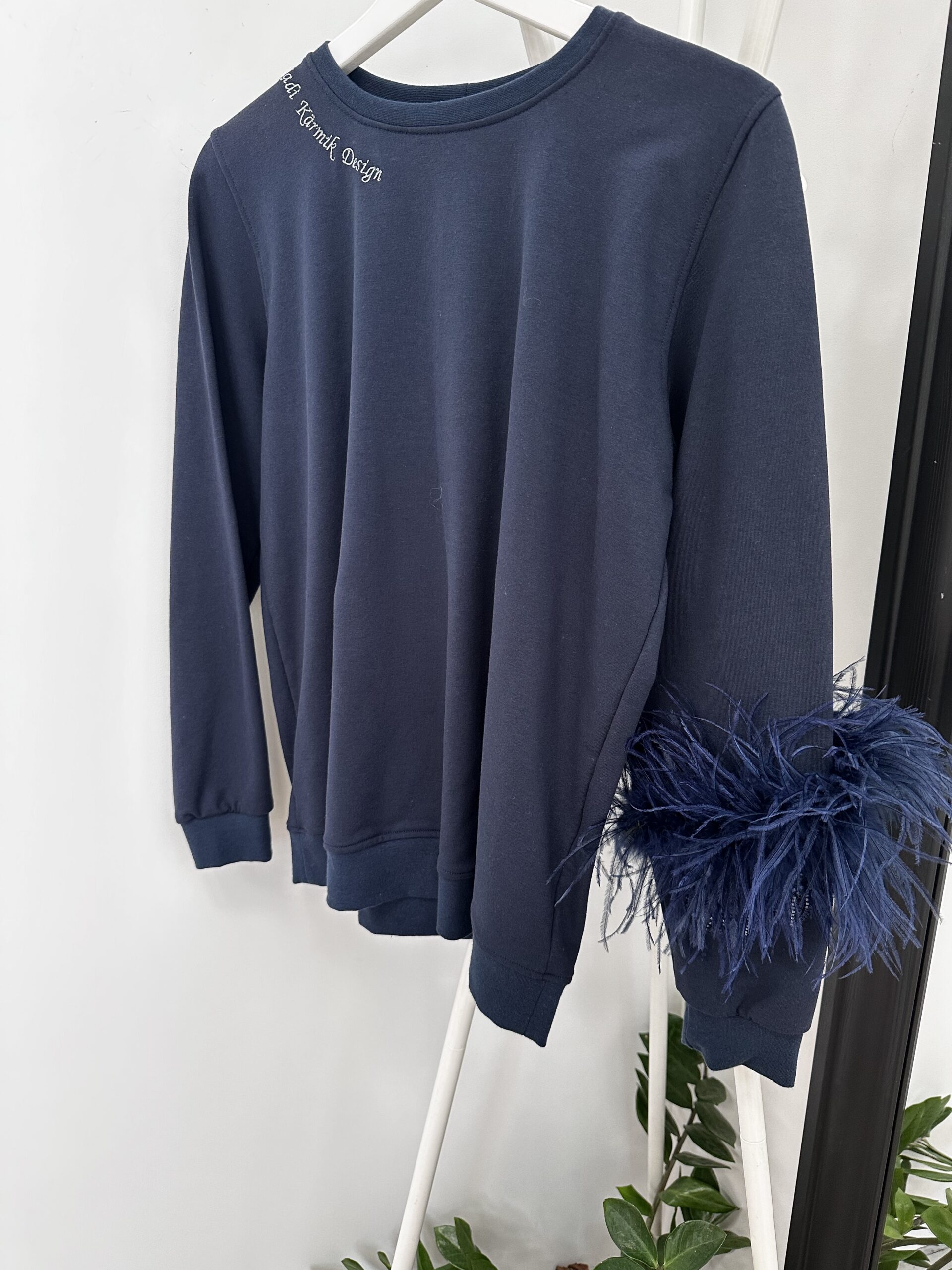 Tumesinine pusa millel on ühel varrukal suled, mille saab pesemise ajaks eemaldada